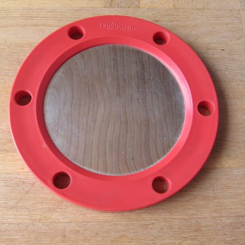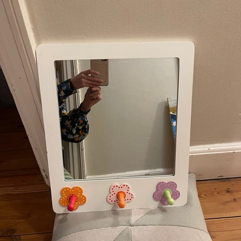 Dette er et børnespejl med en farverig ramme, der måler 23 x 21 cm. Rammen er hovedsagelig rød og dekoreret med gule prikker. Spejlet har en legetøjshænger fastgjort, som inkluderer en sød gul blød figuranhæng. Der er også en blå rem, som kan bruges til at hænge spejlet. Dette spejl kan servicere som underholdning eller stimulere barnets sanser.