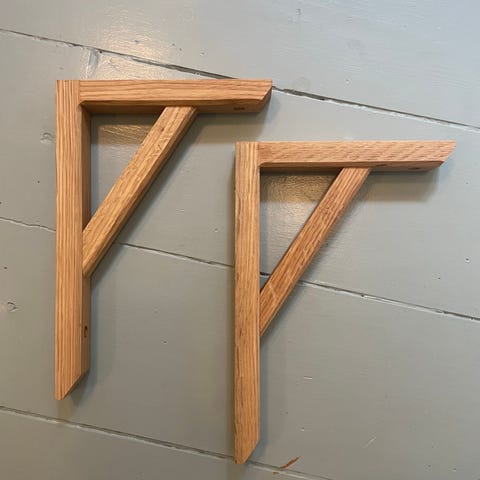 To sæt hyldeknægte lavet af lyst træ. De er designet til at støtte hylder og har flere forborede huller til montering. Hvert sæt består af to hyldeknægte med måler 225x200 mm.