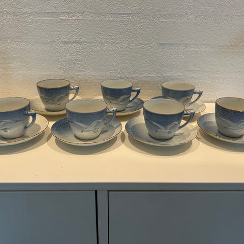 Mågestel med guldkant. Små mokkakopper med underkop UDEN SKÅR.