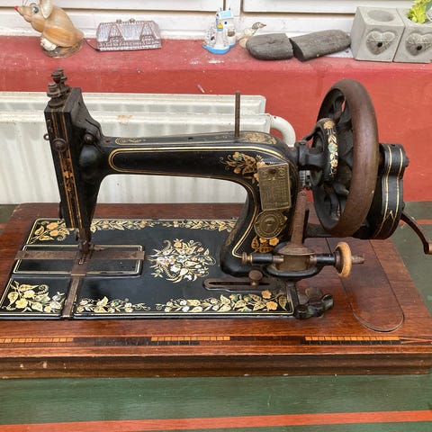 Denne genstand er en vintage miniature symaskine med bevægelige dele. Den er dekoreret med detaljerede blomstermønstre og udsmykninger i levende farver på en sort baggrund. Symaskinen har en manuel håndcrank og en base, der holder en stabil position. Den lille størrelse på 10x10 cm gør den perfekt som en dekorativ genstand eller en samlerobjekt. Mærket Western Germany.