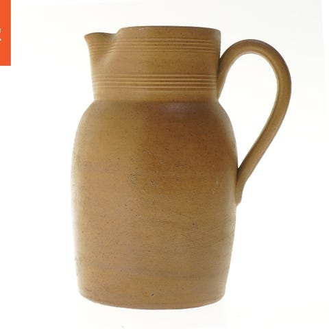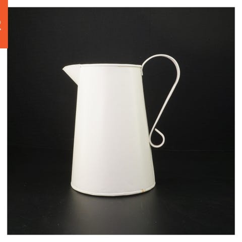 Denne keramiske kande har et rustikt design med en hvid glasur og svage linjer på overfladen. Den er udformet med en bred hank og en kort tud, der gør det nemt at hælde væsker. Kanden har en diameter på 13 cm og er velegnet til servering af varme drikke eller andre drikkevarer. Dens håndlavede udseende giver den en unik charme.