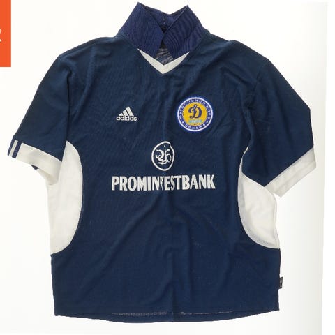 Fodboldtrøje med kort ærme og Adidas logo. Trøjen har et klublogo centralt på forsiden. Der er hvide striber langs ærmerne og kontrastpaneler i siderne.