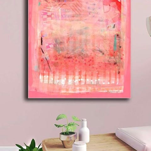 Dette er et indrammet kunsttryk med en farverig abstrakt baggrund i lilla og blå nuancer samt hvide blomstermotiver. Rammen er sort og har en bagplade, der sikrer billederne. Rammens størrelse er 42,5x32,5 cm.