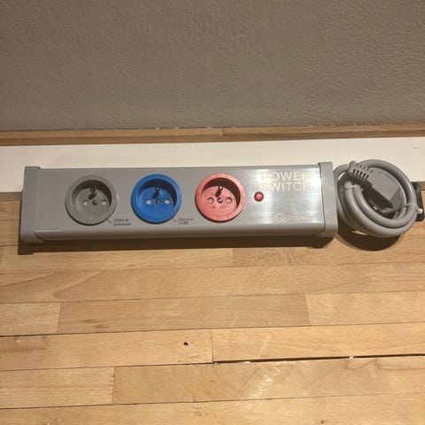 Quooker Power Switch med tre farvede stik (grå, blå og rød) til tilslutning af Quooker system. Enheden har et kabel med stik til strømtilførsel og er designet til at styre forskellige Quooker komponenter, der kræver strøm. Størrelsen er 33,5x7,5 cm.
