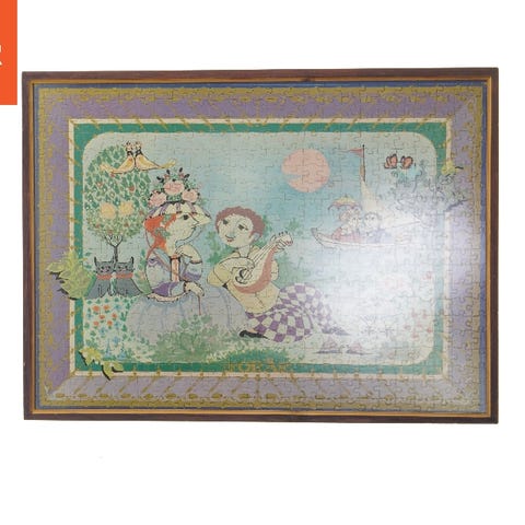 Objektet er et puslespil monteret i en alu ramme. Puslespillet har et kunstnerisk motiv med en figur siddende og forskellige genstande omkring, alle farvet i nuancer af blå, rød og gul. Rammen er firkantet og lavet af aluminium med en bagbeklædning og ophængningsmuligheder. Størrelsen på objektet er 40x60 cm.