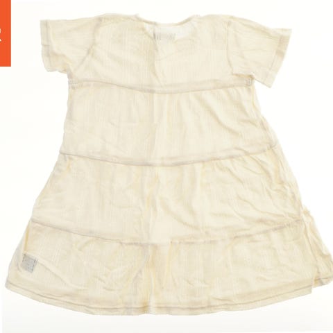 Kortærmet kjole til børn med et vandmelonmønster. Kjolen har en rund halsudskæring og er lavet i en lys gul farve med små vandmelonillustrationer over hele stoffet.