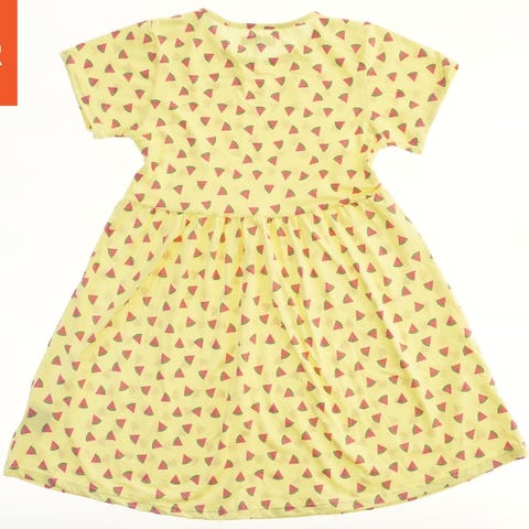 Sæt bestående af en gul bluse og shorts med et mønster af små vandmelonskiver. Blusen har korte ærmer og en flæsekant nederst. Shortsene har en elastisk talje.