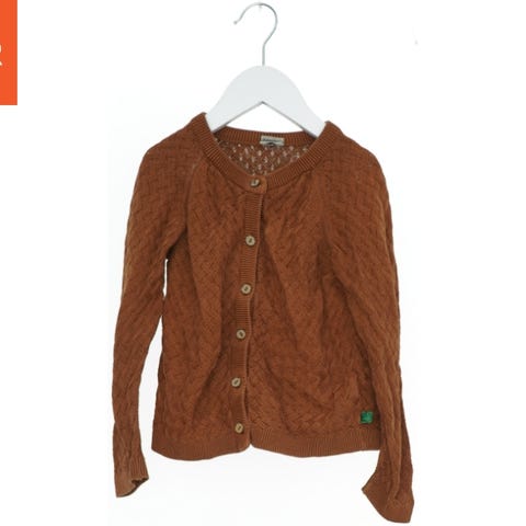 En grå cardigan med lange ærmer. Den har knapper foran og ribkant ved manchetter og nederst.
