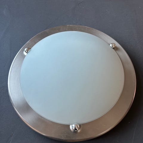 Denne runde loftlampe har en diameter på 25 cm. Lampen er lavet af glas og har metalbeslag, der holder den. Den er designet til at monteres direkte i loftet og har forberedt ledninger til installation. Lampen er relativt enkel med en glat, matteret overflade.