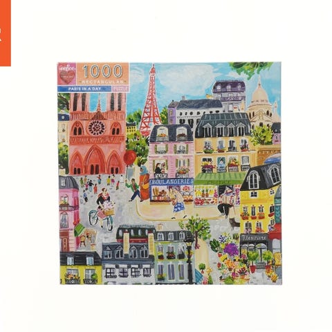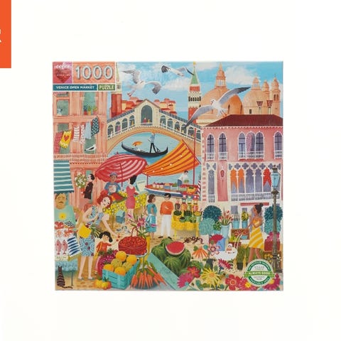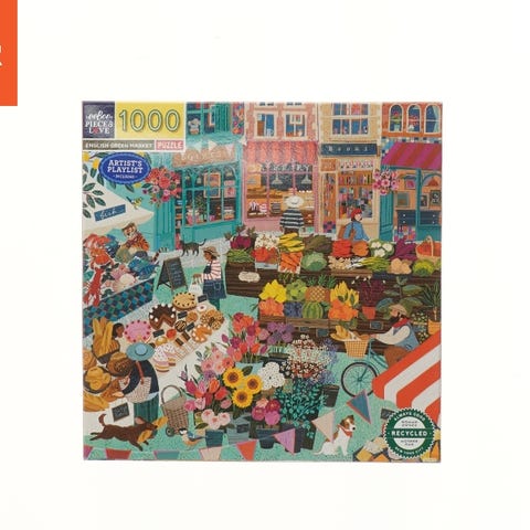 Et farverigt puslespil med 1000 brikker, der forestiller en landsby med forskellige bygninger og blomster. Boksen har dimensionerne 28x28 cm. Forsiden viser det endelige motiv med Tudor-bygninger og blomster i forgrunden.