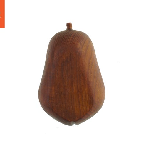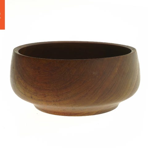 Billedet viser en rund skål lavet af drejet træ med et aftageligt låg. Skålen og låget har en glat overflade og er formet med en bred kant. Skålen måler 19 cm i diameter og kan bruges til opbevaring af små genstande. Farven er en varm brun træfarve.