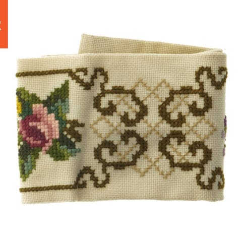 Objektet er en hjerteformet tekstildekoration med et brokademønster i lilla og sort. Det har flere lilla bånd fastgjort, hvilket gør det velegnet til ophængning eller pynt. Størrelsen på objektet er 21 cm.