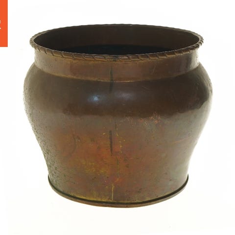 Denne krukke er lavet af kobber og har en antik finish. Den har en unik form med tre håndtag på siderne, hvilket giver den et dekorativt og funktionelt udseende. Krukken har flere patina farver og måler Ø 12x20 cm.