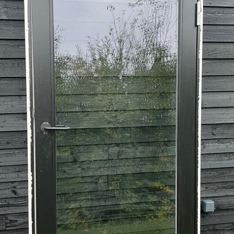Yderdør i hvidt træ med glaspartier. Døren har et klassisk design med flere glasfelter, der giver lysindfald. Passer til indgangspartier i bolig eller mindre erhvervsbygninger. Måler 212x130cm. Lås med nøgler medfølger