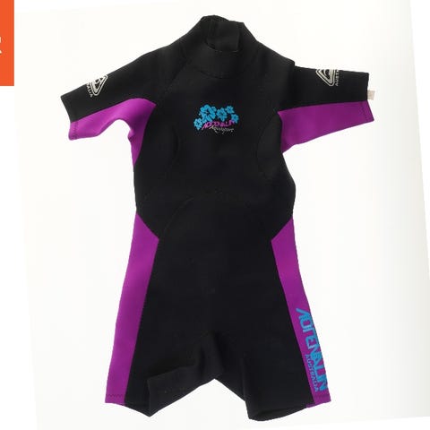Våddragt til børn i lilla med turkis og sort detaljer. Dragt har lange ærmer og ben, samt en lynlås på bagsiden. Der er et O'Neill logo på forsiden og bagsiden af dragten.
