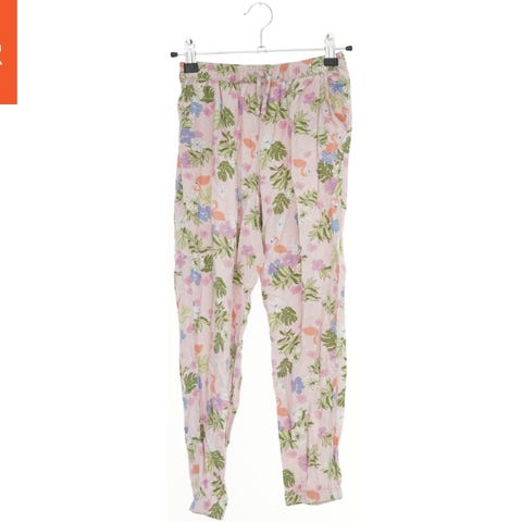 Bukserne har en farverig og detaljeret mønstret design med forskellige geometriske og blomsteragtige motiver. Der er en række farver, herunder blå, rød, hvid og brun, der er arrangeret i et patchwork-lignende mønster. Bukserne har en elastisk linning for komfort.