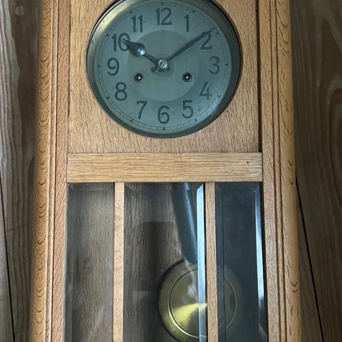Antikt vægur i træ med pendul og glasfront.