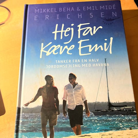 Erichsen Hej Far Kære Emil bog med tema om tanker fra en halv jordomsejling med Havana. Bogens forside viser to personer gående ved vandet med en sejlbåd i baggrunden.