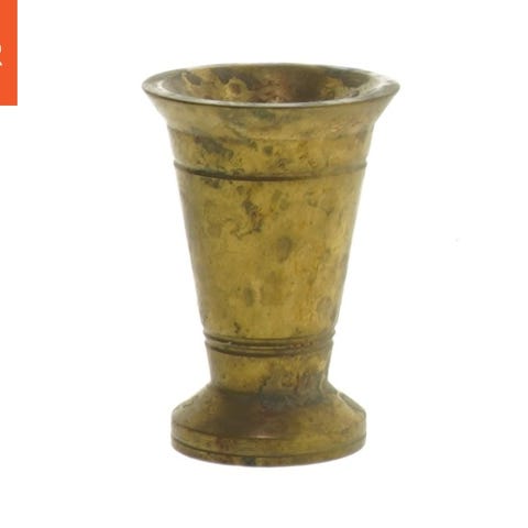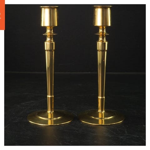 En messing lysestage med en højde på 18 cm. Designet er slankt og har en bred base som sikrer stabilitet. Stagen har en enkelt holder til et lys og er lavet af messing, hvilket giver det en elegant guld farve. Den har en glat overflade med nogle små patina pletter grundet brug.