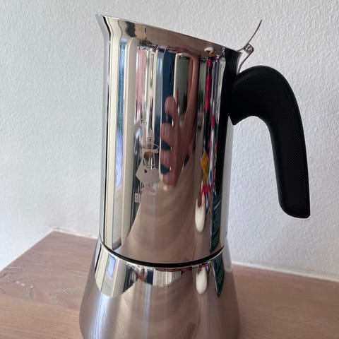 Bialetti Moka Express kaffemaskine i rustfrit stål med sort håndtag. Designet til at brygge kaffe på komfur ved hjælp af damptryk. Velegnet til hjemmebrug og til at lave espresso-lignende kaffe. Fungerer også på induktion!