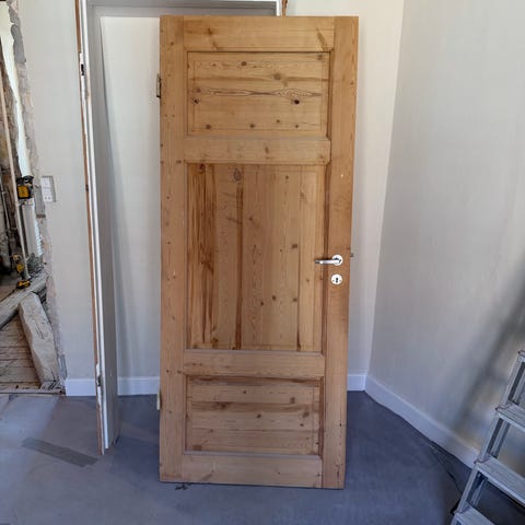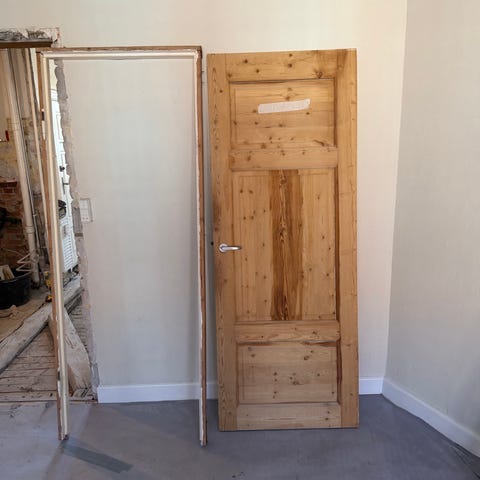 Antik dør med karm. Som ses på fotos. Håndtag er et nyere replika fra Genbyg. Hængslet højre ind.