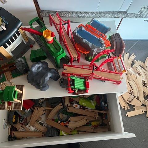Melissa & Doug trætogssæt med flere tog, skinner, broer og tilbehør. Sættet indeholder forskellige elementer til at bygge en togbane, herunder drejeskive og diverse bygninger. Materialet er primært træ, og det er designet til børn.