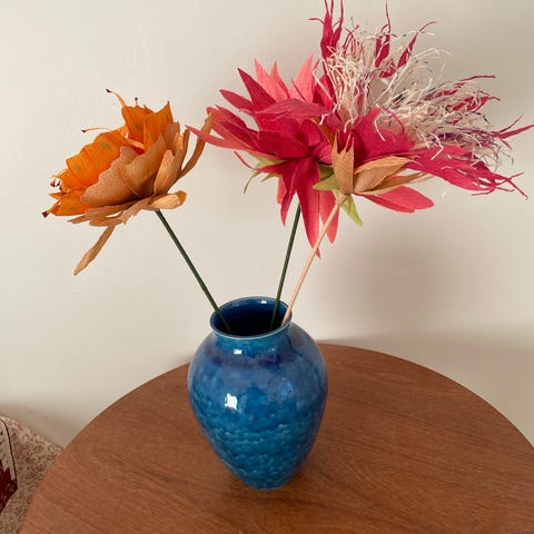 Håndlevet paper , Dekorativ blomsterarrangement bestående af røde blomster i papir, placeret i en blomsterpotte med sort håndtag og floral mønster. Arrangementet indeholder forskellige typer blomster og grønne blade. Der er desuden en rød sløjfe bundet omkring håndtaget. Potten har teksten 'You are Beautiful' på forsiden.