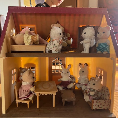 Sylvanian Families dukkehus med tilhørende møbler og figurer. Inkluderer et detaljeret dukkehus med flere rum, diverse møbler og en række små figurer.