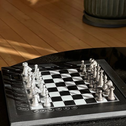Skak-computer med sensorisk input (klik og flyt brik for at spille). Spillet har en hvid ridse forneden og prisen er sat derefter. Fungerer fint.