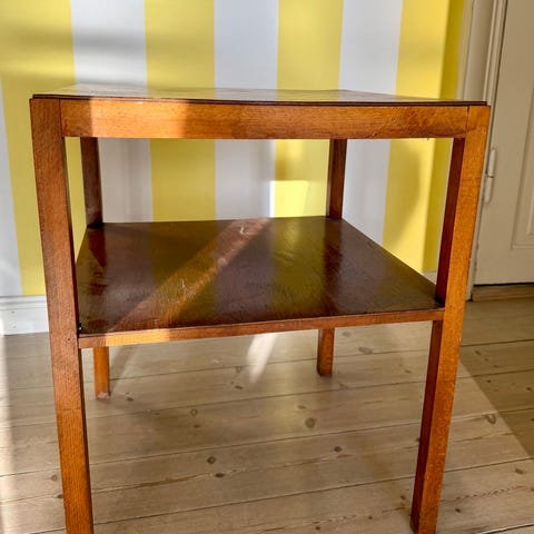 Sælger dette fine lille bord i hvad der ligner teak-finér. Lyserødt under. Kan bruge en kærlig hånd. Vipper en smule.