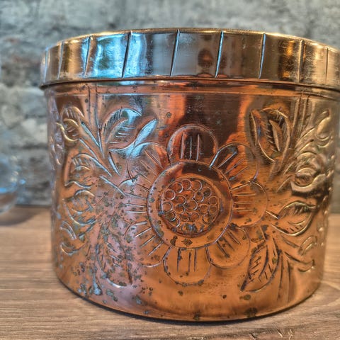 Gammel kobber dåse. Der er lidt rust i bunden. Måler 10 cm. i diameter og 12 cm. i højden.