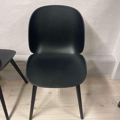 Stel af bøg eller eg, er ikke sikker, sort plast skal med polstret sæde i sort hvidt mønster. Har været brugt som kontorstol, men der har nærmest aldrig siddet nogen i den.