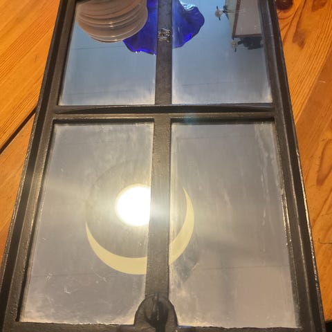 Spejl lavet i gammelt bondegårdsvindue. Rammen er af støbejern.