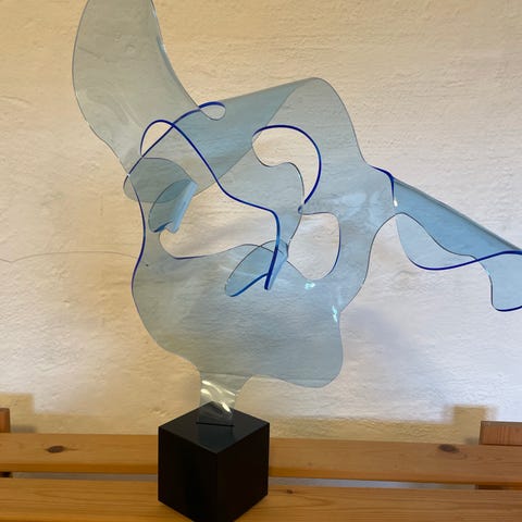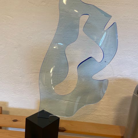 Smuk skulptur i blåt akrylglas udført af kunstner Vivi Linnemann i 2024. Kan hænges op eller stå i fod indsatsen, som er underskrevet af kunstneren.