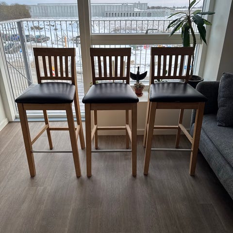 2 stk. Barstole med gaspatron til at justere højden fra 22 cm ved lav højde og 80 cm høj ved højste. Sæde i bøgetræ.
