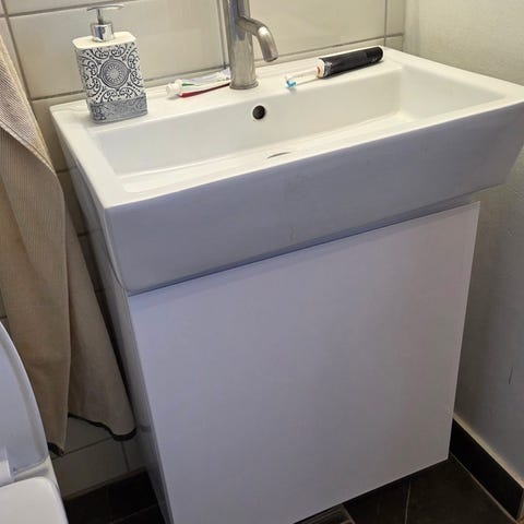 Skabet har to skuffer med håndtag og er designet til badeværelse.