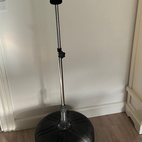 Bokseudstyr bestående af en rød boksebold med stativ og et par boksehandsker i sort og hvid. Længden på benene af stativet er 120 cm og bredden 160 cm. Kan reguleres i højden. Sættet står i Herning, hvor det kan afhentes.