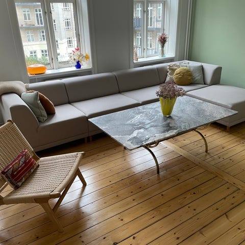 Virkelig pæn sofa i blå med ben i eg fra formel A. 4 år gammel. Oprindelig købt som hjørnesofa, men kan nemt sammensættes som man ønsker. Der er en lille plet maling som vist på billede. Ikke noget man lægger mærke til. Nypris 20.800
