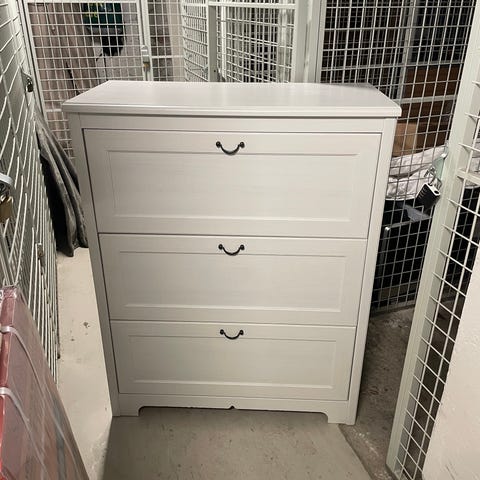 Kommode med 2 små og 5 store skuffer. Skufferne kører godt. Kommoden er 52 cm dyb, 117,5 cm lang, 80 cm bred. Der er brugsmærker øverst på kommoden (se billede).