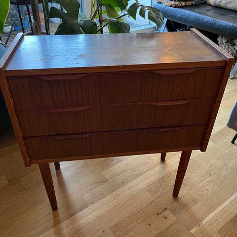 Fin lille kommode med tre skuffer. Blev desværre tabt ud af flyttebil :( og er gået fra hinanden i venstre side. Skal repareres men jeg får det ikke gjort. Måske en derude har lyst til et lille projekt?
