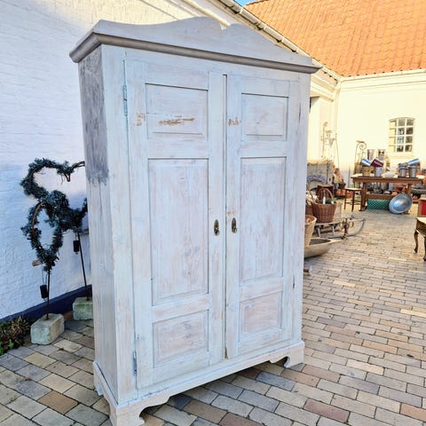 Smukt, gammelt karlekammerskab købt brugt og malet i støvet mintgrøn farve. To skuffer og indbyggede hylder + bøjlestang. Enormt rummeligt. Malingen krakelerer et par steder og står pt. skilt ad i et depotrum. Lidt svært at samle. Sælges derfor billigt. Skal afhentes i Højbjerg (Nettolager).