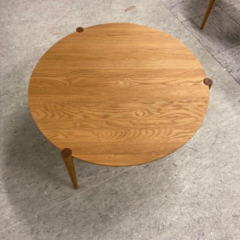 Stine Weigelt har tidligere skabt en pindestol til FDB Møbler. I forlængelse har hun skabt sofaborde og en skammel, der bærer den århusianske designers umiskendelige signatur. Lige som stolen har skamlen og sofabordet tre ben samt den fine lille detalje, hvor den øverste ende af benet møder bordkanten og danner en lille tangerende cirkel. Sofabordet findes i forskellige størrelser, og fungerer sammen som indskudsborde. Når man skal have lidt mere bordplads foran sofaen, kan et ekstra bord nemt findes frem. Bordet er designet til dagligt brug i hjemmet. Med den rette pleje kan dette bord holde mange år frem i tiden. Bordet er fremstillet i massivt egetræ. Egetræ er et naturmateriale, og der vil derfor være naturlige variationer i bordets overflade. Dette gør bordet unikt. Der vil aldrig være to borde som er helt ens.