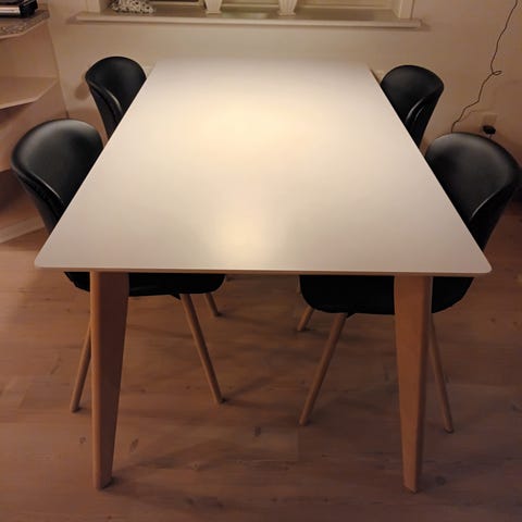 Små brugspor i bordpladen, men kan garanteret pudses op. Egetræsben