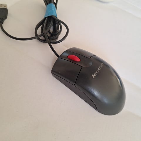 Lenovo kablet USB mus med sort design og rød scrolleknap. Tilsluttes via USB-stik og egnet til brug med computere.