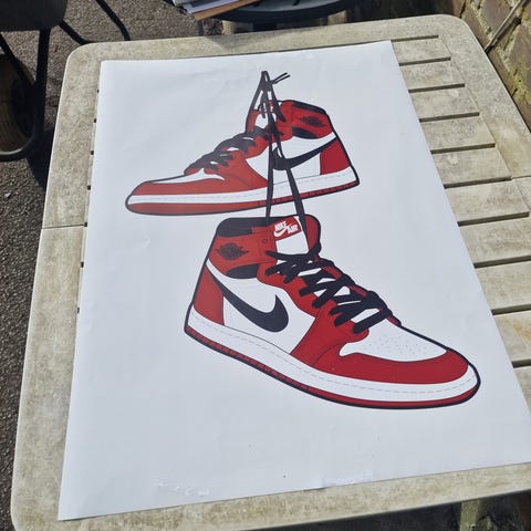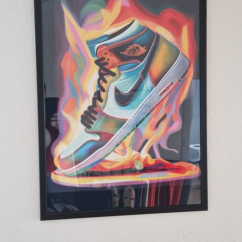 Nike Air Jordan 1 plakat med farverigt og dynamisk design, der viser en sneaker på farvet baggrund. Plakaten er indrammet i sort ramme.