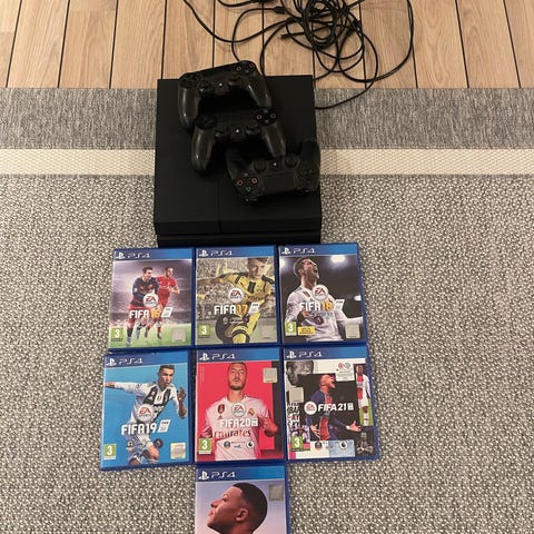 Playstation 4 spilkonsol med to controllere og kamera. Inkluderer flere FIFA-spil til PS4, herunder FIFA 14, FIFA 18, FIFA 19, FIFA 20, FIFA 21, FIFA 22, FIFA 23 .Systemet er sort og kompatibelt med Playstations spiludvalg.