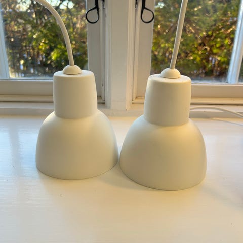 Smuk lille porcelænslampe/pendel fra Mazo. Lampen er i god stand, der er små mærker fra støv, som formentlig kan vaskes af. Den originale ledning er klippet til, den måler nu 178 cm.
