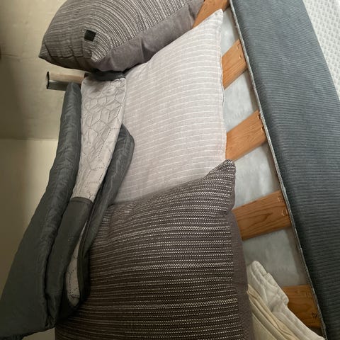 100% bomuld i tyk god kvalitet 2 store faste puder og 3 små.