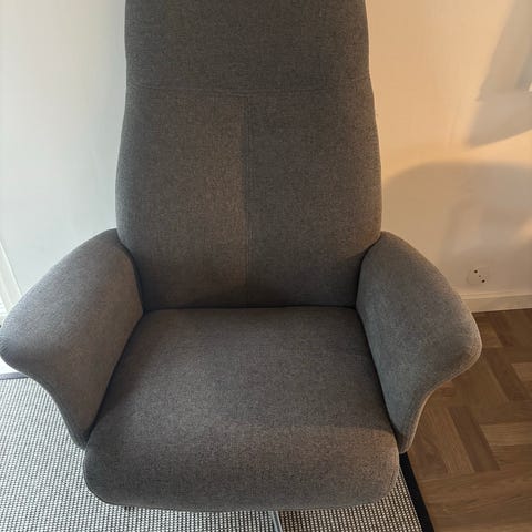 Dreje/vippe lænestol med fodskammel i antrasit stof og sokkel i børstet stål