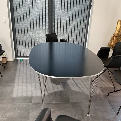 Piet Hein superelipse i kirsebær finér. Udført hos frits hansen. Brugsspor, finér skader ved kanten. Bordplade med varmemærker. Se foto